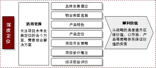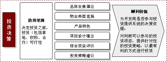 商务园区,主要是指以第三产业为主要产业的服务型园区,如创意产业园、金融服务园,其物业形式除配套物业外,大多表现为商务花园、LOFT等商务办公物业。无论是生产型的工业园区,还是服务型的商务园区,百度地产从一开始项目立项、投资决策到最后的定位、概念规划,都能为政府、开发商等不同性质的主体,提供不同深度的顾问运营服务。具体如下表:
