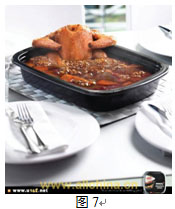 图7是某餐盒的广告,该餐盒的广告词为:食物也需要舒适的dish,初看广告便立即被其创意所吸引。一只煮熟的鸡类似于人类在浴缸中泡热水澡一样靠在餐盒的一角,餐盒里面是正在冒着热气的汤汁,类似于洗澡的热水。画面温馨,给人一种很舒适的感觉。