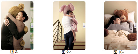 图8、9、10为Downy洗衣液的系列平面广告。广告中分别为丈夫与妻子拥抱的画面、父亲与孩子拥抱的画面以及丈夫与妻子相拥入睡的画面。不过不同的地方在于,丈夫和父亲的形象都由一个柔软、可爱的毛绒玩具所代替的。